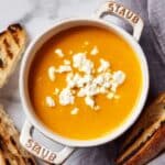 This 15 Minute Beer Cheese Soup is a rich and creamy comfort food classic. Made with sharp cheddar cheese, pale ale beer, and a smooth roux base, it’s packed with flavor and perfect for a quick weeknight meal or game day gathering. Garnished with crumbled feta cheese and served with crusty bread, this soup blends cheesy goodness with a subtle beer bite for an unforgettable bowl of warmth.