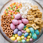 A festive and colorful Easter Snack Mix that’s perfect for quick and easy holiday treats. This mix combines berry-flavored Cheerios, Easter-themed pretzels, speckled malt eggs, gluten-free snickerdoodle bunny cookies, pastel candy corn, caramel M&Ms, and mini marshmallows into a delightful combination of sweet and salty flavors, ready in just 5 minutes.