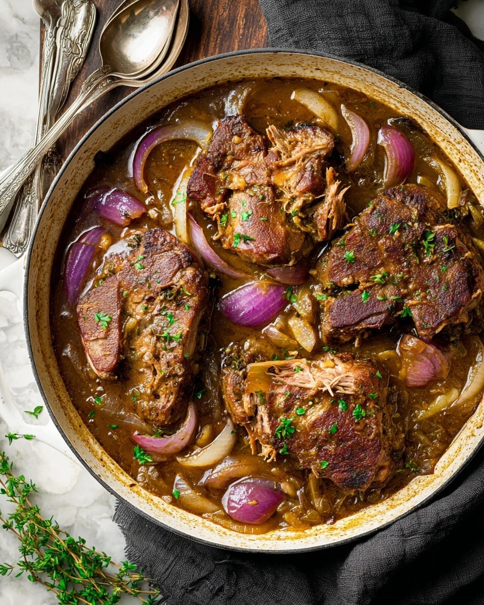 In the same pot, add sliced red onion and the top-sliced garlic head, cooking until the onions soften slightly. Deglaze with apple cider and chicken stock, scraping up all those tasty brown bits from the bottom—you don’t want to lose any of that flavor. Next, stir in apple cider vinegar, dark brown sugar, and dijon mustard to balance sweet, tangy, and savory notes. Toss in your rosemary and thyme sprigs and return the pork chunks back to the pot, making sure they’re nicely nestled into the liquid.
