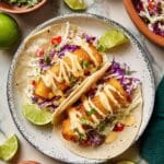 Warm your tortillas just before serving. I like to lightly toast mine on a dry skillet for softness with a bit of char. Pile on the freshly cooked fish, then spoon generous amounts of slaw and creamy sauce on top. Don’t forget to add extra cilantro and a squeeze of lime for that fresh finish!