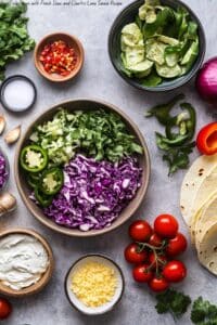 Start by finely slicing the red and green cabbage since that crunch is the heart of your slaw. Dice the tomato and onion small, and finely chop the jalapenos and cilantro. Toss everything together in a large bowl with sour cream, lime juice, salt, sugar, and freshly ground black pepper. I usually make the slaw first so the flavors have time to marry—plus, it saves you time later on.