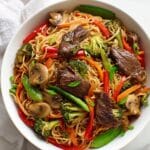 I’ve frozen this stir fry once or twice with decent results, but I recommend freezing the beef and veggies separately from the noodles if you can. The noodles tend to get mushy after thawing, so it’s best to cook fresh noodles upon reheating.