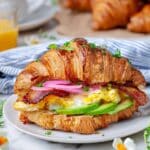 Yes! Swap the bacon for a plant-based alternative and omit the cheese or use a vegan cheese substitute. Replace eggs with scrambled tofu seasoned similarly for a delicious vegan breakfast croissant sandwich variant.