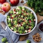 I usually store any leftover broccoli salad in an airtight container in the fridge and try to eat it within 24 hours. After that point, the broccoli and apples can start to get a little soggy. If you want to keep it crisp, I recommend storing the dressing separately and tossing right before serving.