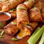 These Buffalo Chicken Mozzarella Logs are a crispy, flavorful appetizer perfect for game day or any casual gathering. Tender shredded buffalo chicken wrapped around a gooey mozzarella string cheese stick in a crispy egg roll wrapper, fried to golden perfection and served with your favorite dipping sauces like ranch, blue cheese, or extra buffalo sauce.