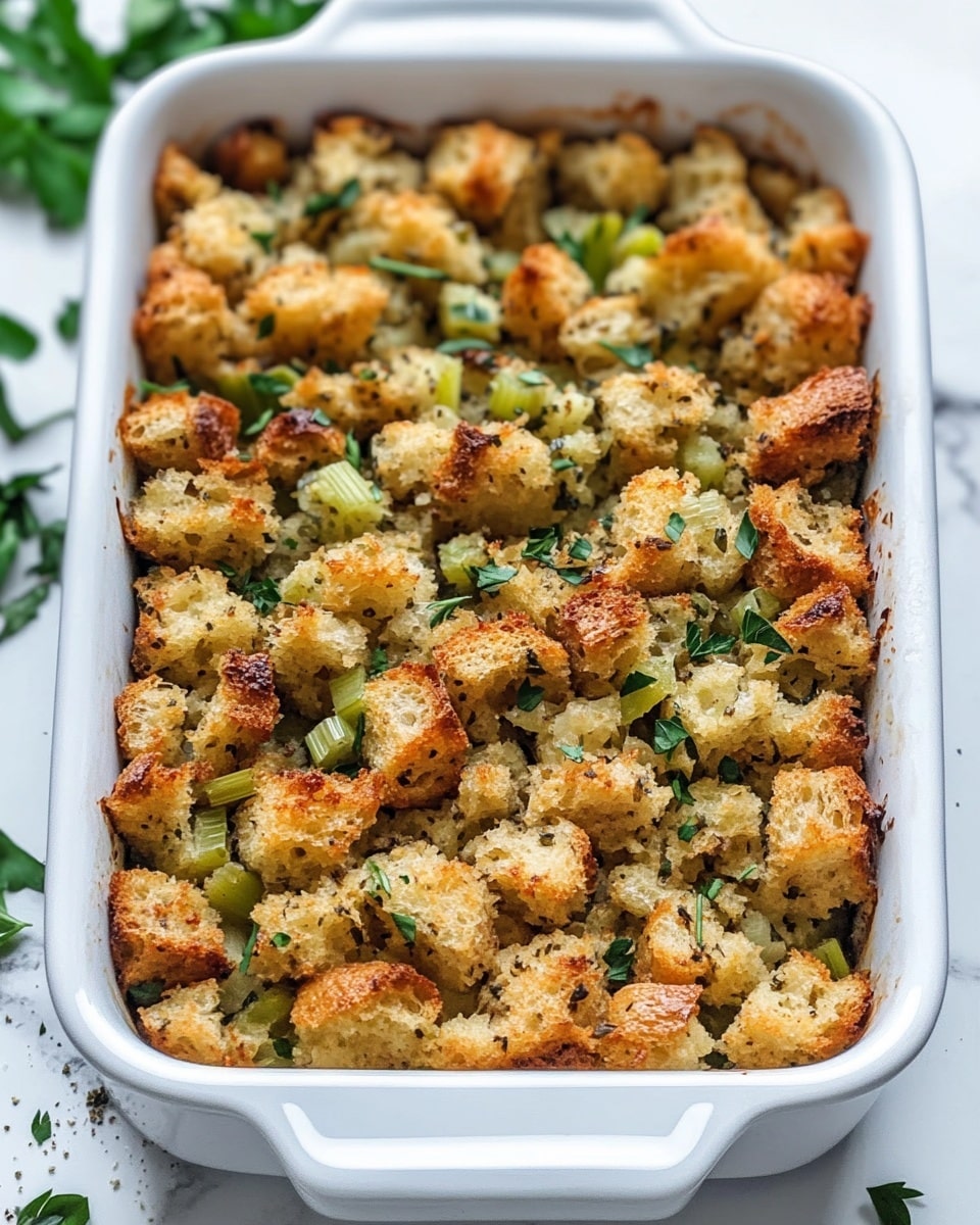 This buttery herb stuffing pairs beautifully with roast turkey, chicken, or even pork tenderloin. I like serving it alongside roasted Brussels sprouts, glazed carrots, or a bright cranberry sauce to balance the richness. It’s also fantastic with simple green beans tossed in garlic butter.