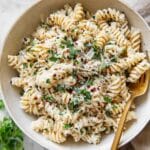 I’m a big fan of topping this dish with a sprinkle of freshly grated parmesan and a few twists of cracked black pepper — it adds that fresh, sharp note on top of the creamy richness. Sometimes I throw on some toasted pine nuts or a handful of chopped fresh basil for a bit of crunch and herbal brightness that takes the dish next level.