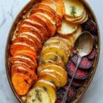 Keywords: root vegetable gratin, cheesy gratin, sweet potato parsnip beet gratin, creamy vegetable bake, holiday side dish
