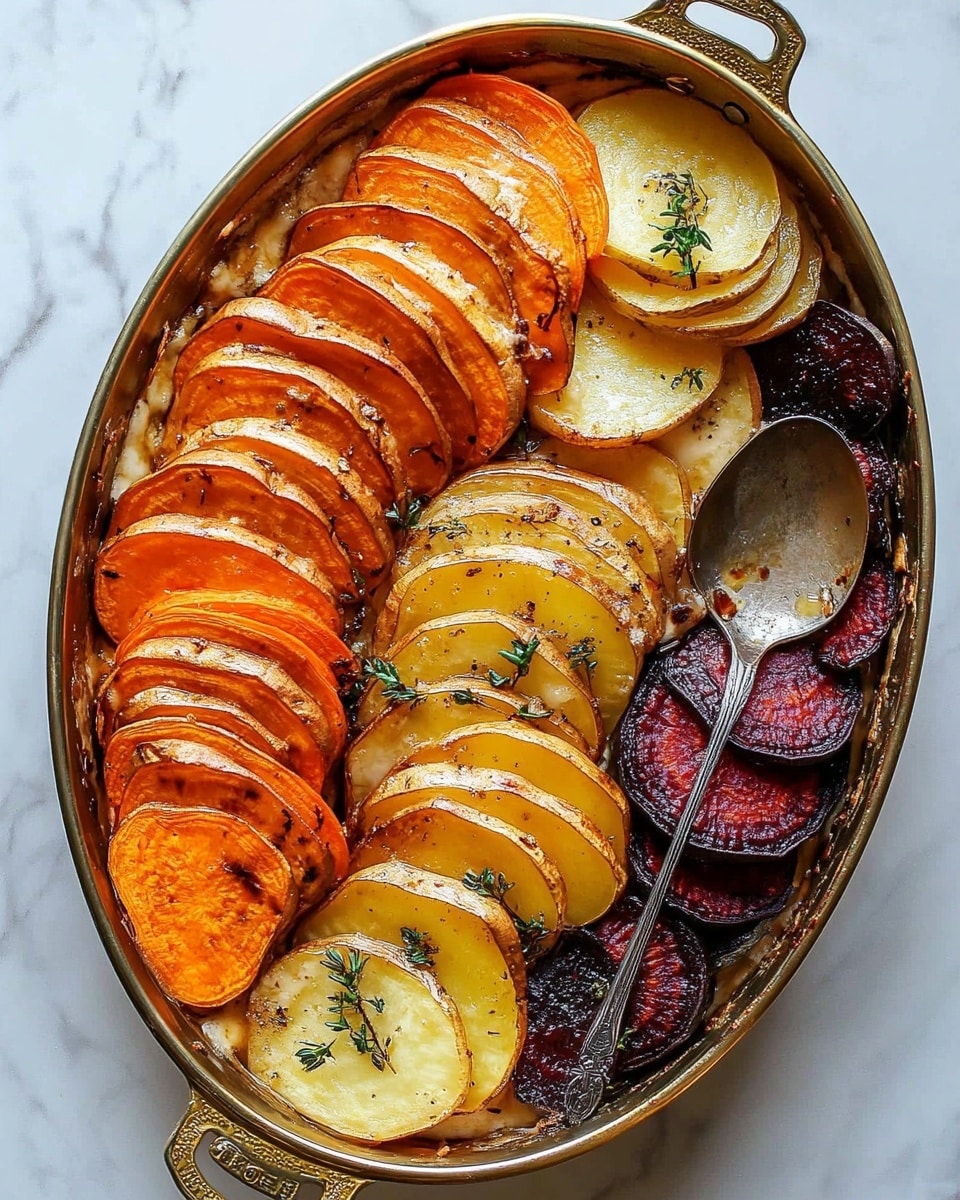 This Cheesy Root Vegetable Gratin is a comforting and elegant dish featuring layers of sweet potatoes, parsnips, and beets baked in a creamy mixture of heavy cream, garlic, and thyme, topped with a golden crust of Parmesan and Gruyere cheeses. Perfect as a flavorful side dish for any meal, it combines the natural sweetness of root vegetables with rich, melted cheese for a hearty and satisfying gratin.