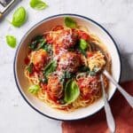 - Serve: Divide the pasta between plates, spoon over the meatballs and sauce, and garnish with fresh basil leaves and additional grated Parmesan if desired. Serve immediately.