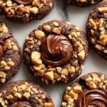 Chocolate Hazelnut Thumbprint Cookies are rich, buttery cookies infused with cocoa and studded with chopped toasted hazelnuts. Each cookie is perfectly shaped with a thumbprint indentation filled with creamy chocolate hazelnut spread, offering a delicious combination of crunchy texture and smooth, chocolaty sweetness. These cookies are ideal for festive occasions or everyday indulgence.