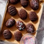 Working with a few eggs at a time, dip each into the melted chocolate and use a fork to lift and shake off any excess. Place it back on your lined baking sheet and quickly decorate with sprinkles or a pinch of flaky sea salt while the chocolate is still wet. The contrast of the crunchy salt with sweet chocolate is absolutely heavenly!