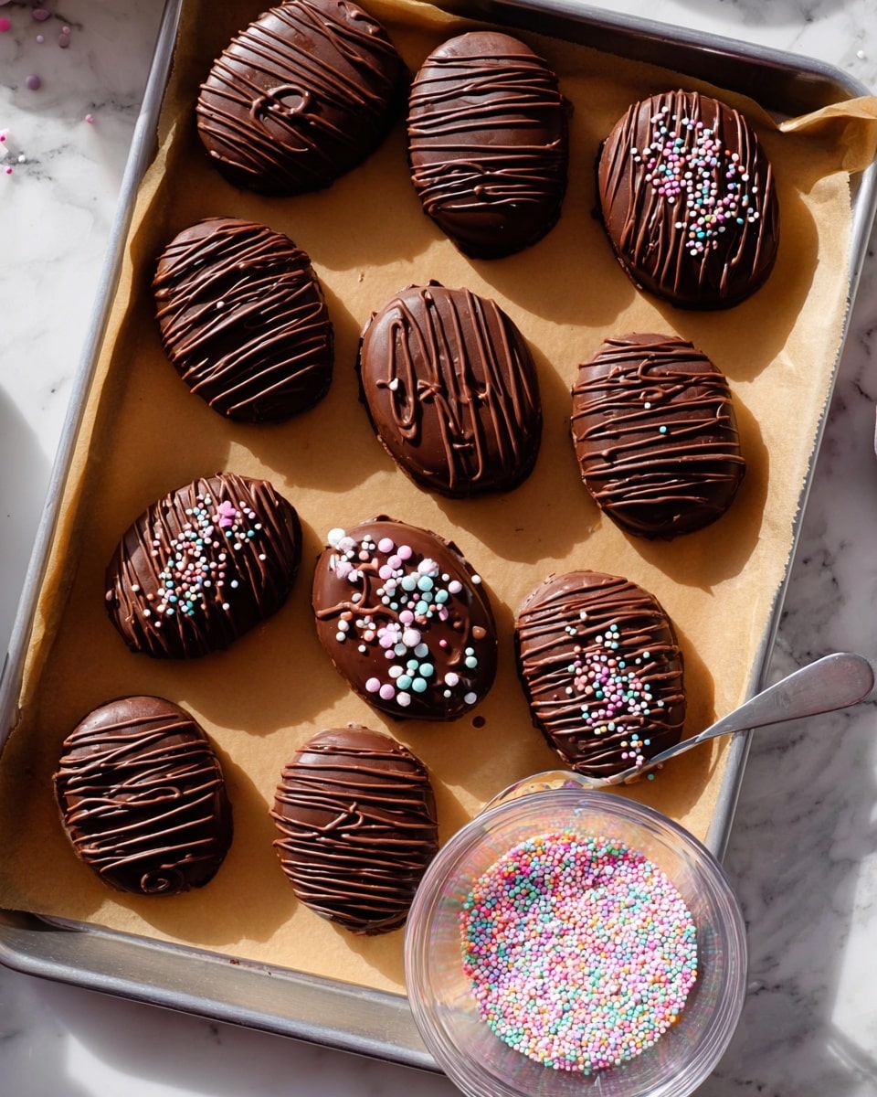 - Decorate and Set: Once chocolate coating sets slightly, drizzle leftover melted chocolate over eggs and sprinkle with pastel non-pareils or flaky sea salt as desired. Reheat chocolate gently if needed for drizzling.
