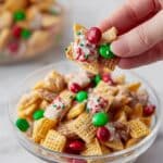 This festive Christmas Chex Mix combines the perfect crunch of Rice and Wheat Chex cereals, Bugles snack chips, and sourdough pretzel nibblers with the sweet touch of white chocolate candy melts and colorful holiday mini M&M’s. Finished with crushed peppermint candies and red, white, and green nonpareil sprinkles, this snack mix is an irresistible holiday treat perfect for sharing or gifting during the festive season.