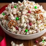 Christmas Crunch is a festive and delicious white chocolate popcorn treat, perfect for holiday snacking or gifting. This sweet and salty mix combines freshly popped popcorn, creamy vanilla candy melts, crunchy pretzels, colorful red and green M&Ms, and festive Christmas sprinkles for a fun and easy-to-make holiday snack mix.