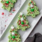 Celebrate the holiday season with these festive Christmas Rice Krispie Treats, featuring classic marshmallow goodness tinted green for a vibrant, holiday look and decorated with red Hots or holiday sprinkles for a fun, colorful finish. Perfect for holiday parties, cookie exchanges, or a delightful seasonal snack that kids and adults alike will enjoy.
