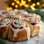 - Ice and decorate: Once the rolls have cooled slightly, drizzle the icing over the top and add sprinkles or edible decorations as desired to enhance the festive look.