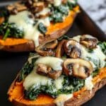 Keywords: stuffed sweet potatoes, mushroom and spinach, creamy filling, baked sweet potatoes, vegetarian dinner, healthy comfort food