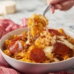 - Layer the Cheese and Pepperoni: Sprinkle 1 ½ cups of shredded mozzarella cheese evenly over the pasta mixture for the first layer. Add half of the sliced pepperoni on top. Then, add another layer by sprinkling 1 ½ cups of mozzarella and the remaining pepperoni. Finally, top with the remaining 1 cup of shredded mozzarella.