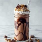 - Serve: Pour the shake into glasses and top with optional coconut whipped cream, chopped hazelnuts, and shavings or chunks of dark chocolate to add texture and extra decadence.