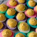 Keywords: Easter deviled eggs, colorful deviled eggs, holiday appetizer, dyed eggs, deviled eggs recipe, party snacks, spring recipes