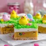 These Easter Sugar Cookie Bars feature a soft, sprinkle-loaded cookie base topped with a creamy coconut frosting and festive green-dyed coconut flakes. Finished with Easter Peeps and jelly beans, they make an adorable and delicious holiday treat perfect for spring celebrations.
