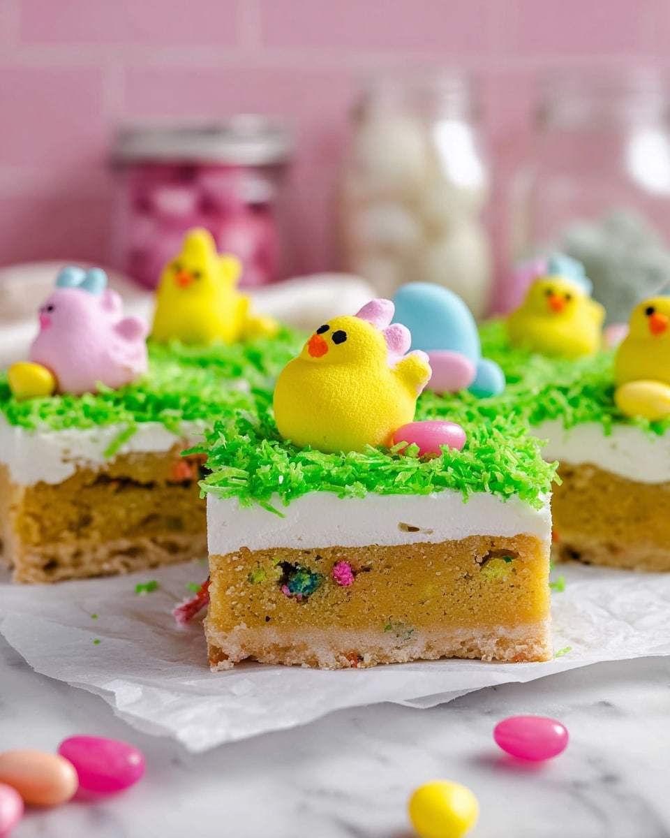 Lift the cooled bars out of the pan using the parchment and spread frosting evenly. For the festive topping, toss coconut flakes with a few drops of green food coloring inside a sealed bag until dyed your preferred Easter grass green. Sprinkle this over the frosting, then add Easter Peeps and jelly beans on top of each slice just before serving. Pro tip: Cut first, then add toppings so the bars slice cleanly.
