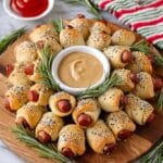 This Everything Pigs in a Blanket Wreath is a fun and festive appetizer perfect for any gathering. Mini hot dogs are wrapped in crescent roll dough, brushed with egg wash, then sprinkled generously with everything bagel seasoning for a crunchy, savory twist. Served with ketchup and mustard, this easy-to-make wreath looks impressive and tastes delicious.