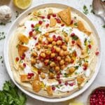Honestly, I don’t recommend freezing the full assembled Fatteh because the pita chips lose their crunch and the yogurt sauce changes texture. However, you can definitely freeze the cooked chickpeas and hummus separately to save time next time you want to whip it up quickly.