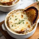 French Onion Soup freezes well without the bread topping. I portion the soup into freezer-safe containers and freeze for up to 2 months. When thawing, do so overnight in the fridge and reheat slowly on the stovetop to retain that rich flavor and prevent separation.