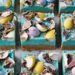 Spread the frosting evenly over the cooled bars, then crush sugar-coated mini chocolate eggs in a zip-close bag and sprinkle them on top. Press them gently to help them stick, and then slice into bars when you’re ready to serve!