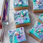 - Frost the bars: Spread the purple and blue frostings creatively over the cooled bars to create a whimsical unicorn-inspired design. Optionally, garnish with sprinkles for an extra festive touch.
