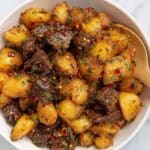 To reheat, I recommend warming the steak bites and potatoes in a skillet over medium-low heat with a splash of water or broth to prevent drying out. Avoid microwaving if you can, since it tends to toughen the steak and make the potatoes soft.