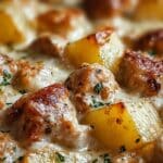 - Pour the Sauce: Pour the prepared Parmesan and garlic sauce evenly over the chicken and potatoes, ensuring all pieces are well coated.