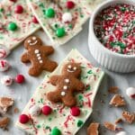 This Gingerbread Chocolate Bark recipe combines the creamy sweetness of white chocolate with warm, festive spices like ginger, cloves, and nutmeg, then is topped with crunchy gingerbread cookies and colorful holiday candies. It’s a perfect no-bake treat that captures the holiday spirit in every bite—easy to prepare and delightful to share.