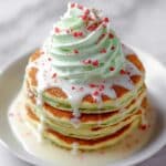 These festive Grinch Green Pancakes are a fun and colorful breakfast treat perfect for the holiday season or any time you want a pop of green on your plate. Fluffy and tender pancakes are infused with vibrant green food coloring and topped with a luscious cream cheese icing. For an extra festive touch, the pancakes are served with green whipped cream and red heart sprinkles, making them as delightful to look at as they are to eat.