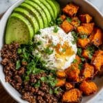 - Assemble the Bowl: Once the sweet potatoes and beef are ready, layer roasted sweet potatoes in a serving bowl. Top with the cooked ground beef.