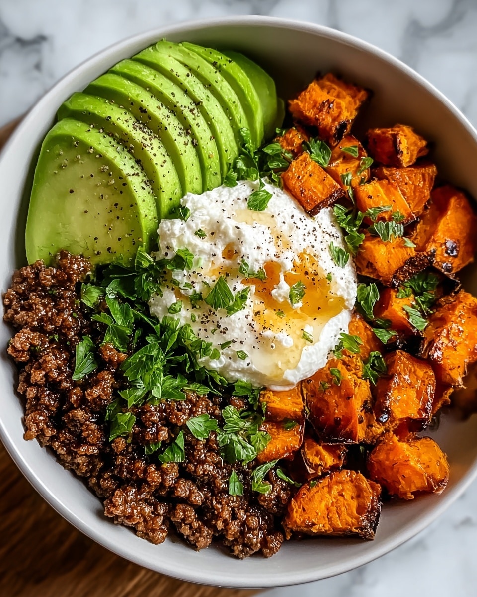 This Ground Beef Hot Honey Bowl is a comforting and flavorful meal combining savory roasted sweet potatoes, seasoned ground beef, creamy cottage cheese, fresh avocado, and a spicy-sweet drizzle of hot honey. Perfect for those craving a balanced dish with a touch of heat and freshness.