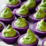These Halloween Deviled Eggs combine classic deviled egg flavors with spooky green and red food coloring to create a fun, festive appetizer perfect for Halloween parties. The creamy avocado and light mayo provide a rich filling balanced with Dijon mustard and garlic salt for a flavorful bite.