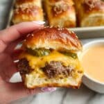 These Hawaiian Roll Cheeseburger Sliders are a delicious, bite-sized twist on classic cheeseburgers, perfect for gatherings or family dinners. Juicy ground beef patties seasoned with salt and cracked pepper are cooked and topped with melty Colby jack or American cheese, served on sweet and soft Hawaiian rolls with diced sweet onion, dill pickles, and a zesty homemade burger sauce.