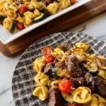 You can definitely slice your steak and prep your veggies in advance to save time on cooking day. I like to have the tortellini ready and sauce mixed before starting to cook so everything comes together quickly and smoothly.