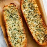 To reheat, I pop slices in a toaster oven or under the broiler for just a couple of minutes until warm and crispy again. You want to avoid microwaving if possible because it can make the bread chewy and limp, which defeats the whole point of garlic bread!