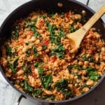 When the rice is nearly tender and the liquid mostly absorbed, stir in the fresh spinach a handful at a time, letting each batch wilt before adding more. It softens quickly and adds a fresh green pop to your skillet. Cover once more for a few minutes so the spinach fully cooks and everything comes together in that warm, cozy skillet magic. Then, it’s ready to serve!