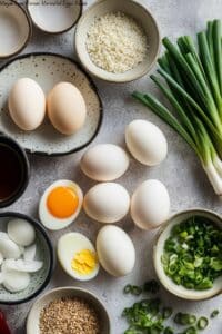 While the eggs cool, get your marinade ready. Combine finely chopped yellow onion, minced garlic, green onions, and the optional chili pepper in a bowl. Add toasted sesame seeds, soy sauce, honey (or your choice of syrup), and water. Stir everything together to create that deliciously complex marinade.