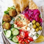 Keywords: Mediterranean bowl, falafel bowl, healthy bowl, vegetarian bowl, tahini sauce, hummus, pita bread, Greek salad