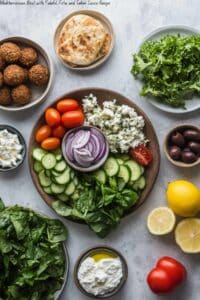 These ingredients combine textures and flavors that complement each other beautifully, making the bowl fresh, filling, and delicious. When shopping, look for high-quality falafel (homemade or store-bought) and fresh feta for the best results.