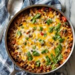 This Mexican Beef and Rice Skillet is a delicious and easy one-pan meal combining seasoned ground beef, jasmine rice, black beans, corn, and a flavorful blend of taco seasoning and Rotel diced tomatoes. Topped with melted cheese and customizable taco toppings, it’s perfect for a quick, satisfying weeknight dinner.