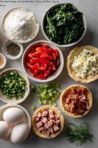 First, preheat your oven to 375°F (190°C). Lightly spray a muffin tin with cooking spray to prevent sticking. Roll out your pie crust rounds and gently press them into each muffin cup. I find a small glass or cup helps push the dough evenly to the bottom and sides with no holes. Prepare your toppings: chop spinach, roast and dice peppers if not prepped, crumble feta, shred cheese, and cook bacon until crisp—these little things make all the difference!