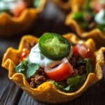 These Mini Taco Salad Cups are a fun and flavorful lunch option perfect for school or any meal on the go. Made with seasoned ground beef, crispy tortilla cups, and fresh toppings like shredded lettuce, tomatoes, and cheddar cheese, they combine all the delicious elements of a taco in a convenient handheld format. Customize with optional additions like sour cream, jalapeños, and salsa for extra zest.