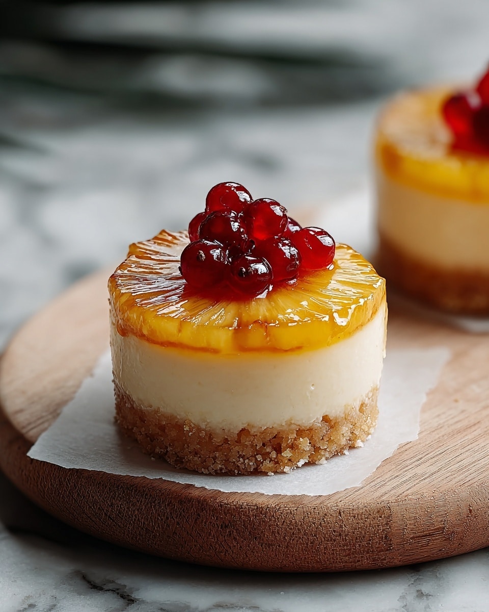For parties, I like to arrange these mini cheesecakes on a tiered dessert stand with tropical-themed decorations — think little paper umbrellas or edible flowers. Another fun idea is serving them with tiny spoons stuck in for a grab-and-go dessert that looks adorable and inviting.